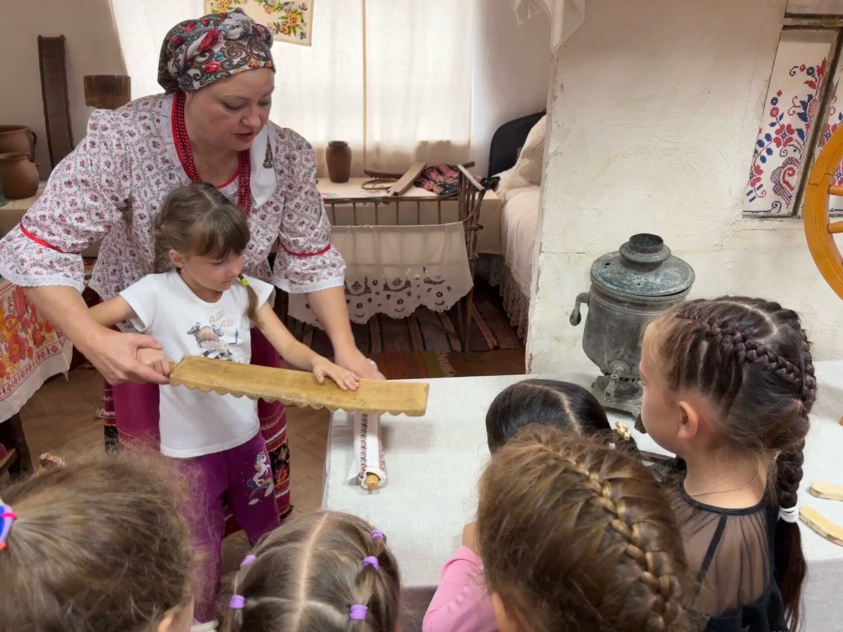В игровой форме ребята познакомились с предметами быта: вышитыми рушниками и салфетками, керамической посудой, узнали об устройстве самовара, назначении утюгов, коромысла, и о многом другом.